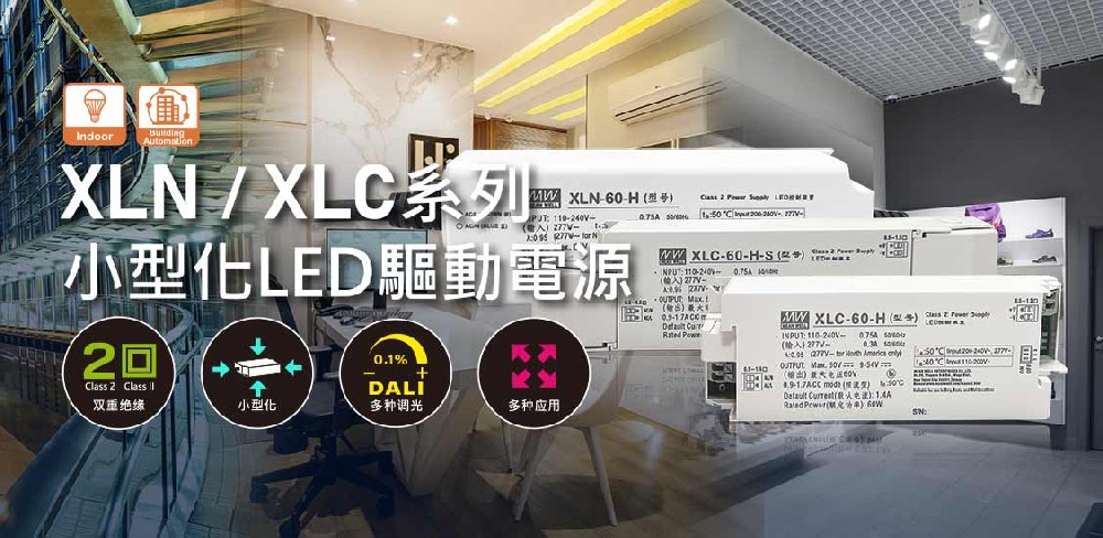 • XLN和XLC系列為明緯最新一代塑膠殼類LED驅動電源,符合雙重絕緣及ClassII/2設計,可提供一般室內及商業照明燈具做搭配使用,具備多種特點包含小型化尺寸、恒壓及恒流輸出、多種調光功能、出線式或端子式接線...等